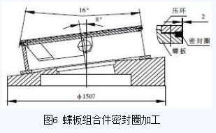 蝶板組合件起密封作用的零件是密封圈,密封圈為斜錐結(jié)構(gòu),其錐頂角為16°,厚度為13.5mm,由5層石棉板及4層不銹鋼板復(fù)合而成(圖6)。密封圈必須與蝶板和壓環(huán)等組裝在一起,加工時才能防止密封圈夾層中的不銹鋼板及石棉板翹曲變形。根據(jù)其結(jié)構(gòu)特點,對蝶板組合件密封圈采用以下加工方法:(1)先在2.5m立車上分別把蝶板和壓環(huán)上的各止口加工到圖紙要求尺寸,外圓不加工;(2)按圖紙要求對壓環(huán)鉆孔,蝶板鉆孔攻絲;(3)壓環(huán)、密封圈和蝶板按圖紙裝配,將蝶板組合件工裝用螺栓緊固在閥體工裝上,然后再將蝶板組合件裝夾其上。立車刀桿旋轉(zhuǎn)8°車壓環(huán)、密封圈和蝶板至磨削尺寸;⑷用同樣厚度鋼板替下密封圈,車壓環(huán)、蝶板各錐面至圖紙尺寸;(5)工裝不動,將壓環(huán)、密封圈、蝶板重新按要求組裝,然后在立車刀架上裝磨頭,對密封圈進行磨削處理,使其達到圖紙設(shè)計粗糙度要求。